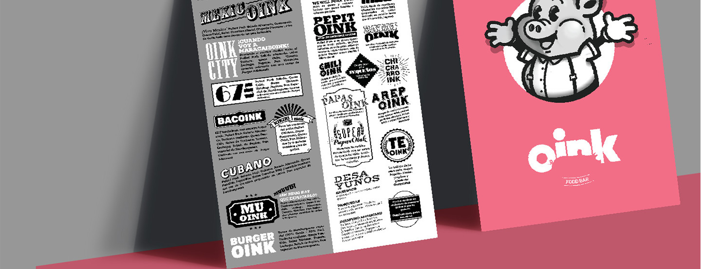 El reciente proyecto de Rebrand para la marca del restuarant de PulledPork Oink, incluía tambien, como es de esperarse, el rediseño de su menú. Su marca necesitaba consolidar y justificar un concepto de caricaturas retro y además llevar al lector a que lo explorara todo en busca de hacer rotar platos que por lo general las personas omitían.